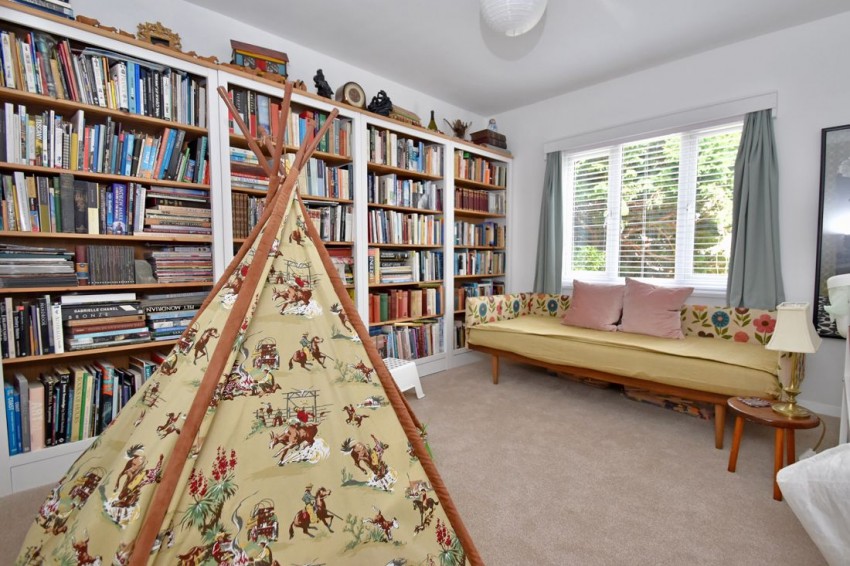 Family Room: 11’11 x 10’10 Full width range of bookshelves, front aspect and radiator.