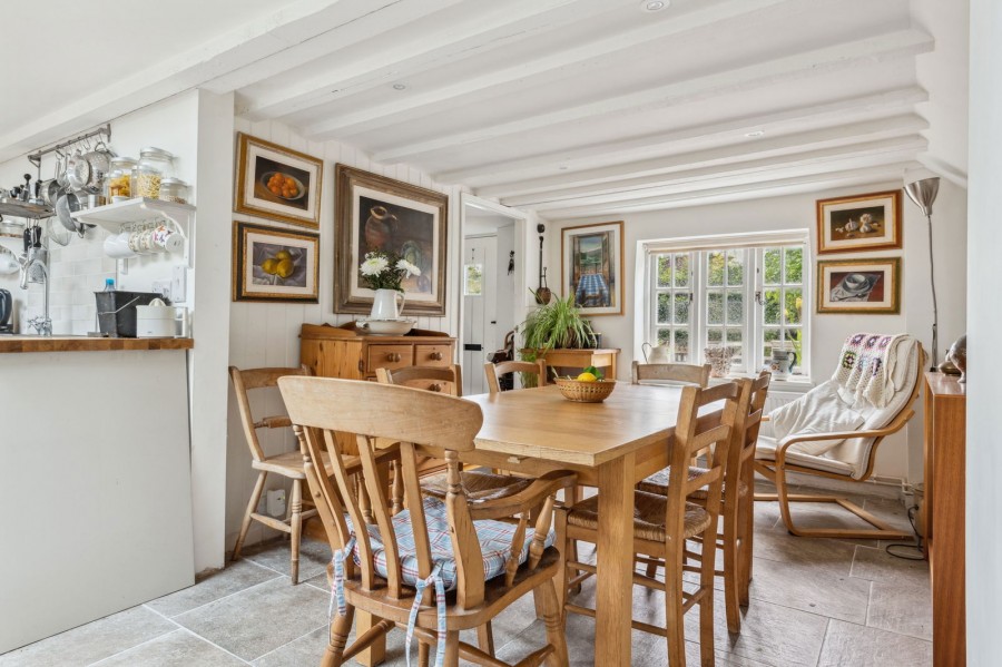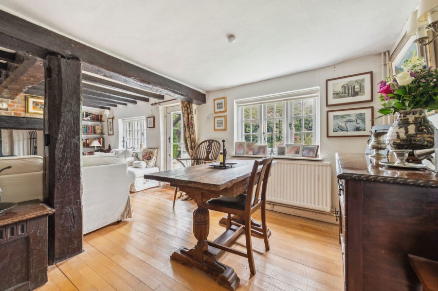Dining Room: 10’5 x 9’10 Window to front, ceiling timbers, panelling, radiator, downlighters. Open to:
